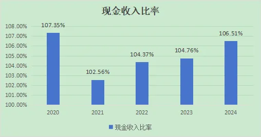 现金收入比例方面还不错,基本都稳定在100%以上,近四年还有一个小幅缓慢的上涨。