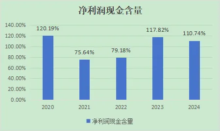 净利润现金含量有较大起伏,尤其是在上面最常提到的2021年和2022年这两个年份,相比于另外三个年份,数据上看有不小的降幅。近两年都能稳定在100%以上,但有下降趋势,按照惯性考虑未来,需要持续关注。