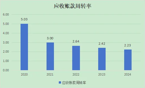 近五年,总资产周转率在2021年走上新高点之后就一路稳定的下降至2024年的新低点。而应收账款周转率更加保持一致稳定的逐年下降至五年前的一半不到,不过这个可能和这家企业本身的业务模式有关,而且客户基本上很多是ZF部门,成为坏账的可能性还是很小的。