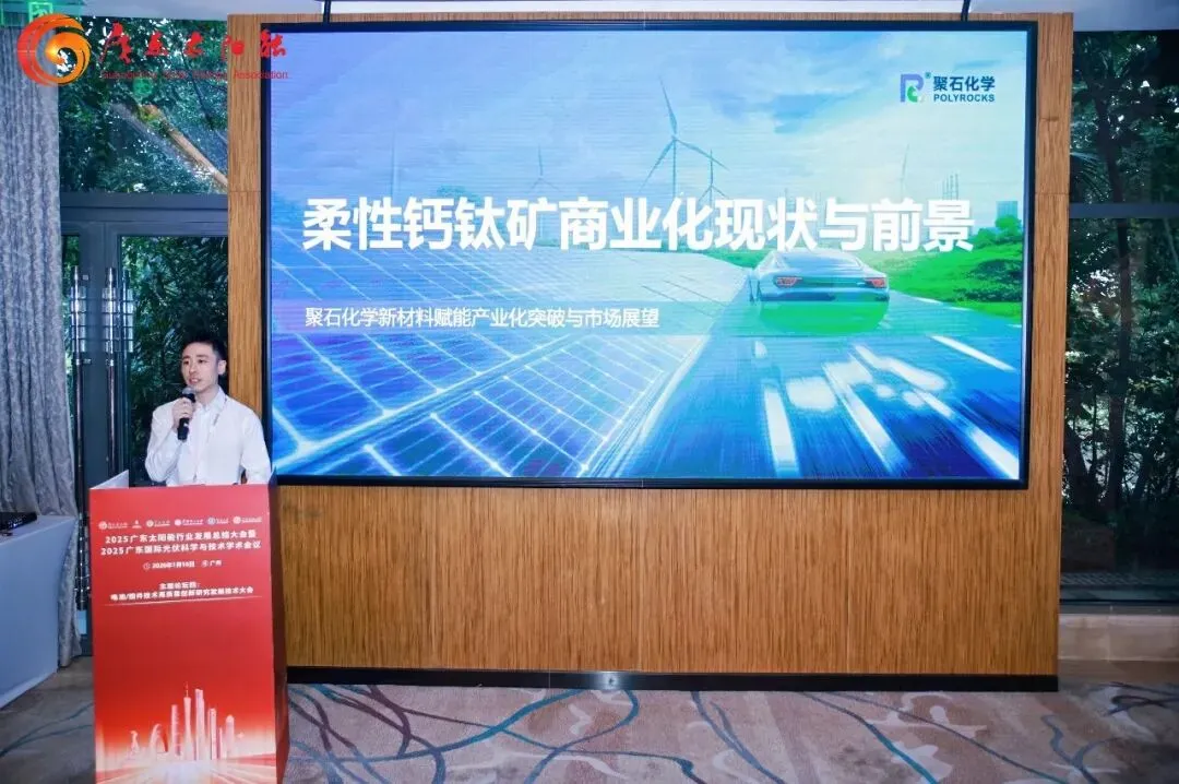 据聚石化学消息,在近日举行的2025广东太阳能行业发展总结大会上,聚石化学钙钛矿项目组高级市场经理曹宇润以《柔性钙钛矿商业化现状与前景》为题,分享了聚石化学在柔性钙钛矿领域的深耕实践与行业洞察。作为跨界布局柔性钙钛矿的新材料上市公司,聚石化学正以清晰的战略路径,推动这一前沿技术从实验室走向商业化落地。