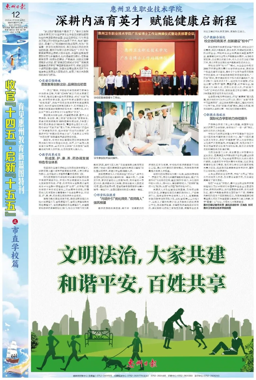 站在“十五五”新起点,惠州卫生职业技术学院将继续以习近平新时代中国特色社会主义思想为指导,聚焦内涵建设,深化教育教学改革,优化师资队伍,提升产教融合深度与国际合作广度,朝着特色鲜明的高水平高职院校迈进,为教育强国建设和粤港澳大湾区卫生健康事业发展作出更大贡献,坚守“医者仁心”初心,书写育人兴邦新篇章。