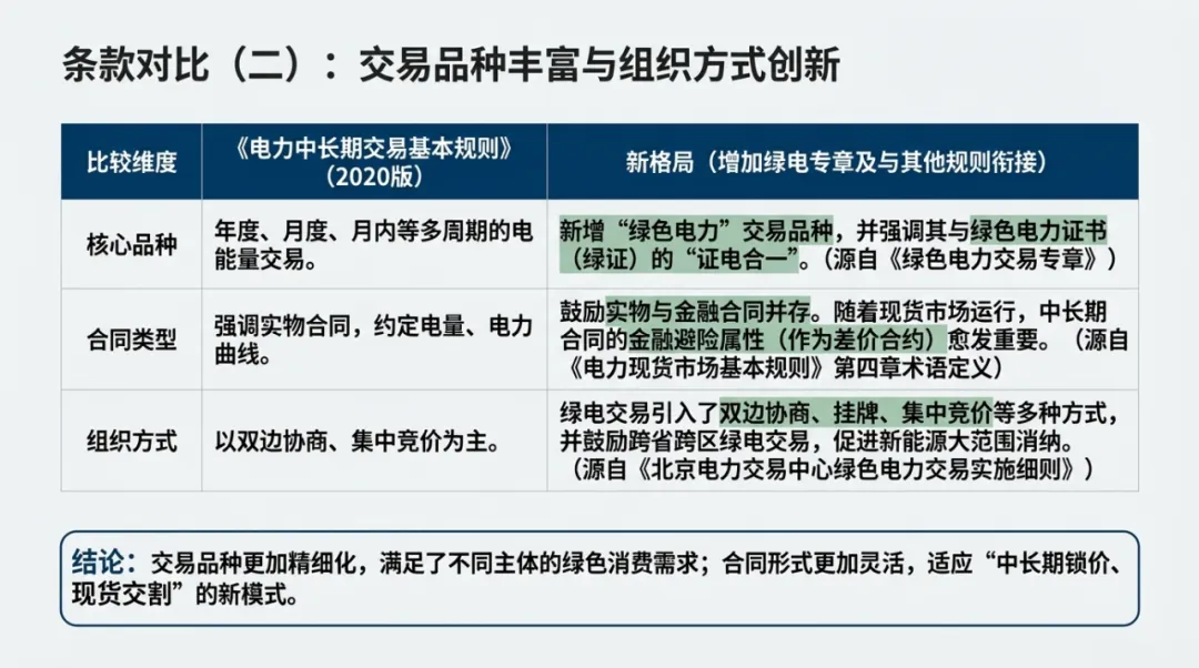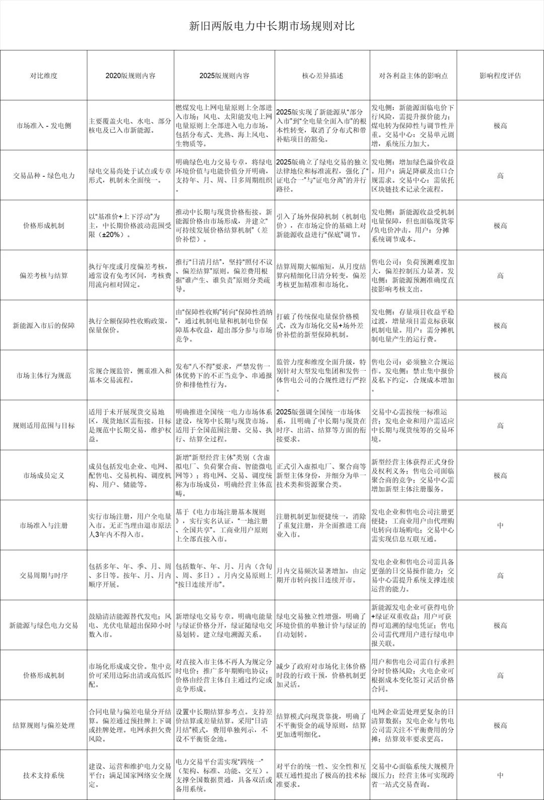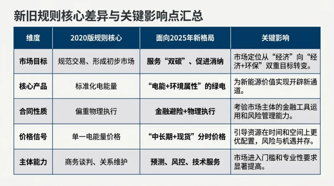 新旧两版规则(以下简称“2020版”与“2025版”*)的对比,不仅是文字上的增减,更是我国电力市场从“以电量为中心”向“以电能价值为中心”的深刻转型。2025版规则(正式名称为《电力中长期市场基本规则》)旨在落实全国统一电力市场体系,其核心变化在于市场成员的扩容、交易频次的加密以及价格形成机制的体系建立。为了直观形象的了解新旧交易规则不同,特地整理下表供大家学习参考↓