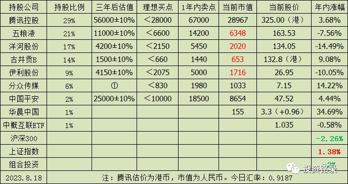目前持仓:腾讯29%,五粮液21%,洋河股份17%,古井贡B 14%,伊利股份9%,分众传媒6%,中国平安2%,华晨中国1%,中概互联网ETF 1%