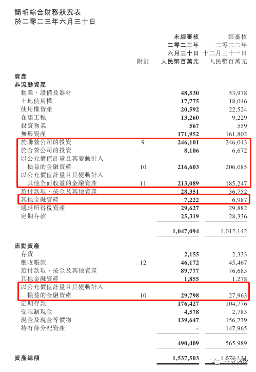 再接下来看腾讯的投资, 联营+合营公司投资公允价值为2542亿,金融资产+其他金融资产公允价值4667,总投资公允价值大概为7209亿。