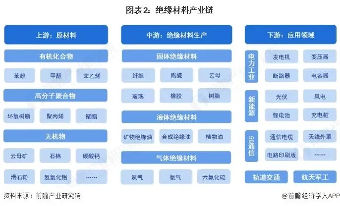 从产业链环节来看,绝缘材料上游产业为原材料,包括苯酚、甲醛、苯乙烯等有机化合物,环氧树脂、聚丙烯、聚酯等高分子聚合物,以及石棉、碳酸钙、滑石粉等无机物;中游为绝缘材料生产环节,包括固体绝缘材料、液体绝缘材料和气体绝缘材料;下游主要为绝缘材料应用领域,包括基础电气、新能源汽车、风力发电、轨道交通、航天军工等领域。