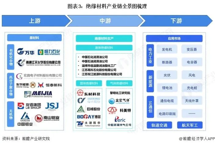 从产业链各环节代表性企业来看,上游原材料环节主要有万华化学、江天化学、宏昌电子、东华能源等企业;产业链中游主要有中国石化润滑油公司、中国石油润滑油公司、双江能源等液体绝缘材料企业,东材科技、裕兴股份、博菲电气等固体绝缘材料企业,以及金宏气体、科美特等气体绝缘材料企业。