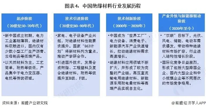 中国经济的快速增长和电力、新能源等下游行业的高速发展为绝缘材料的快速发展和渗透率的提升提供了有力支持。自起步至今,中国绝缘材料行业从“跟跑”到“并跑”,逐步突破“卡脖子”环节,整体来看,其发展历程大致可分为四个阶段:起步、技术引进、技术创新以及产业升级与新能源驱动阶段。