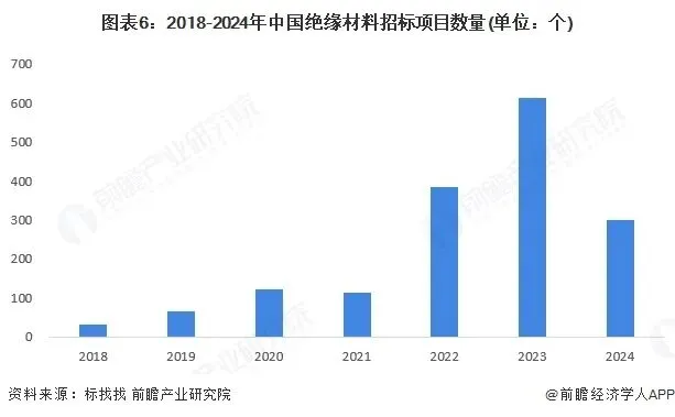 根据招标公告整理,2018-2024年,中国绝缘材料行业招标项目整体呈增长趋势,2023年中国绝缘材料招标项目数量达到近年来峰值,为612个。2024年,中国绝缘材料招标项目数量为300个。