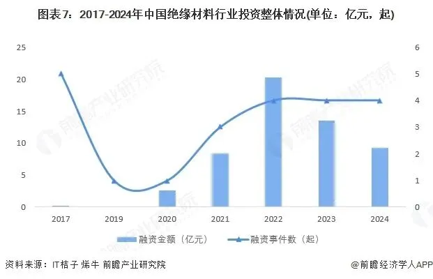 根据IT桔子及烯牛数据,2021年以来,我国绝缘材料行业投融资活跃度有所提升,2022年行业实现融资金额20.25亿元,为近年来峰值。2024年行业共发生投融资事件4起,融资金额约9.3亿元,同比减少31.2%。