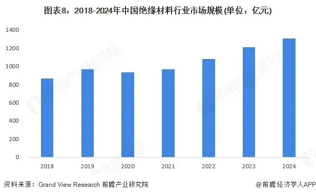 绝缘材料在下游领域的应用十分广泛,涉及风力发电、轨道交通、工业电机、家用电器、新能源汽车、水力发电等领域,近年来,随着我国工业的快速发展,以及新兴领域的需求增加,绝缘材料行业也迎来了新的发展机遇。2018-2023年,我国绝缘材料行业市场规模从864亿元增长至1206亿元,复合增长率为6.9%。结合历年统计数据及市场变动情况,初步统计,2024年我国绝缘材料行业市场规模约1305亿元,同比增长8.2%。