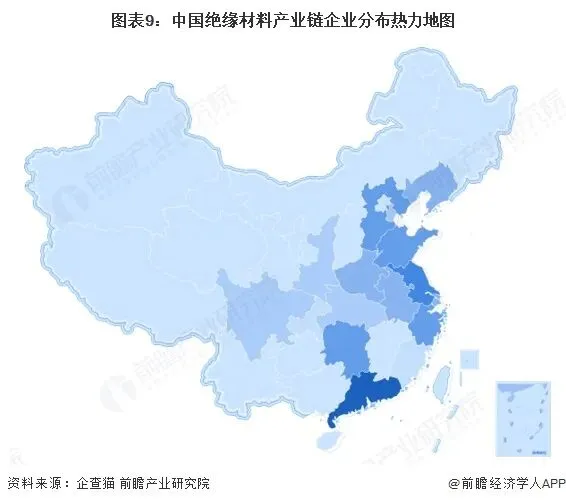 从绝缘材料产业链企业区域分布来看,我国绝缘材料企业分布较为集中,主要分布于经济较为发达的东部沿海地区,以广东省、江苏省和山东省为代表。西部地区绝缘材料企业数量相对较少。