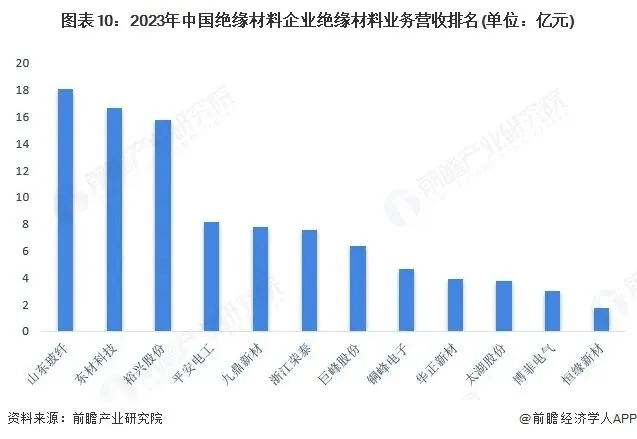 2023年,中国绝缘材料企业中,山东玻纤绝缘材料业务营收超过18亿元,东材科技、裕兴股份绝缘材料业务营收在15亿元以上,领先于其他企业。