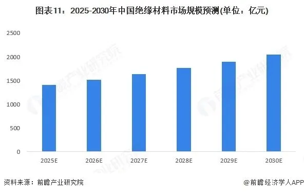 在国家产业政策的支持、技术条件逐渐成熟以及下游消费需求释放的推动下,中国绝缘材料市场规模预计在2025至2030年间持续上升,2030年市场规模将突破2000亿元,2025-2030年的复合年增长率达到7.8%。