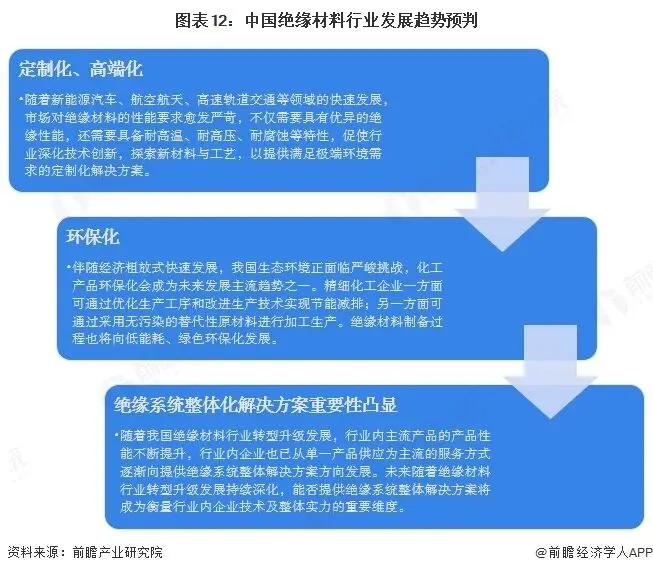 随着产业发展和市场竞争,绝缘材料产品不断丰富完善,技术更新换代周期越来越短,其中生产企业逐渐涌现。近年来,绝缘材料产品不断在向耐高压、耐高温、耐电晕、高导热、无卤阻燃型和环保型等方向发展,行业内企业也在不断提升技术水平、提高产品性能,从而顺应下游电气设备节能、环保的发展趋势。同时,随着我国绝缘材料行业转型升级发展,行业内主流产品的产品性能不断提升,行业内企业也已从单一产品供应为主流的服务方式逐渐向提供绝缘系统整体解决方案方向发展。未来随着绝缘材料行业转型升级发展持续深化,能否提供绝缘系统整体解决方案将成为衡量行业内企业技术及整体实力的重要维度。