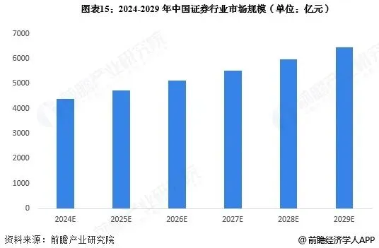 随着我国经济逐步复苏、美联储进入降息周期以及地缘冲突的缓和,前瞻预计我国证券业营业收入规模在未来几年将持续增长,到2029年,我国证券市场规模有望达6441亿元。