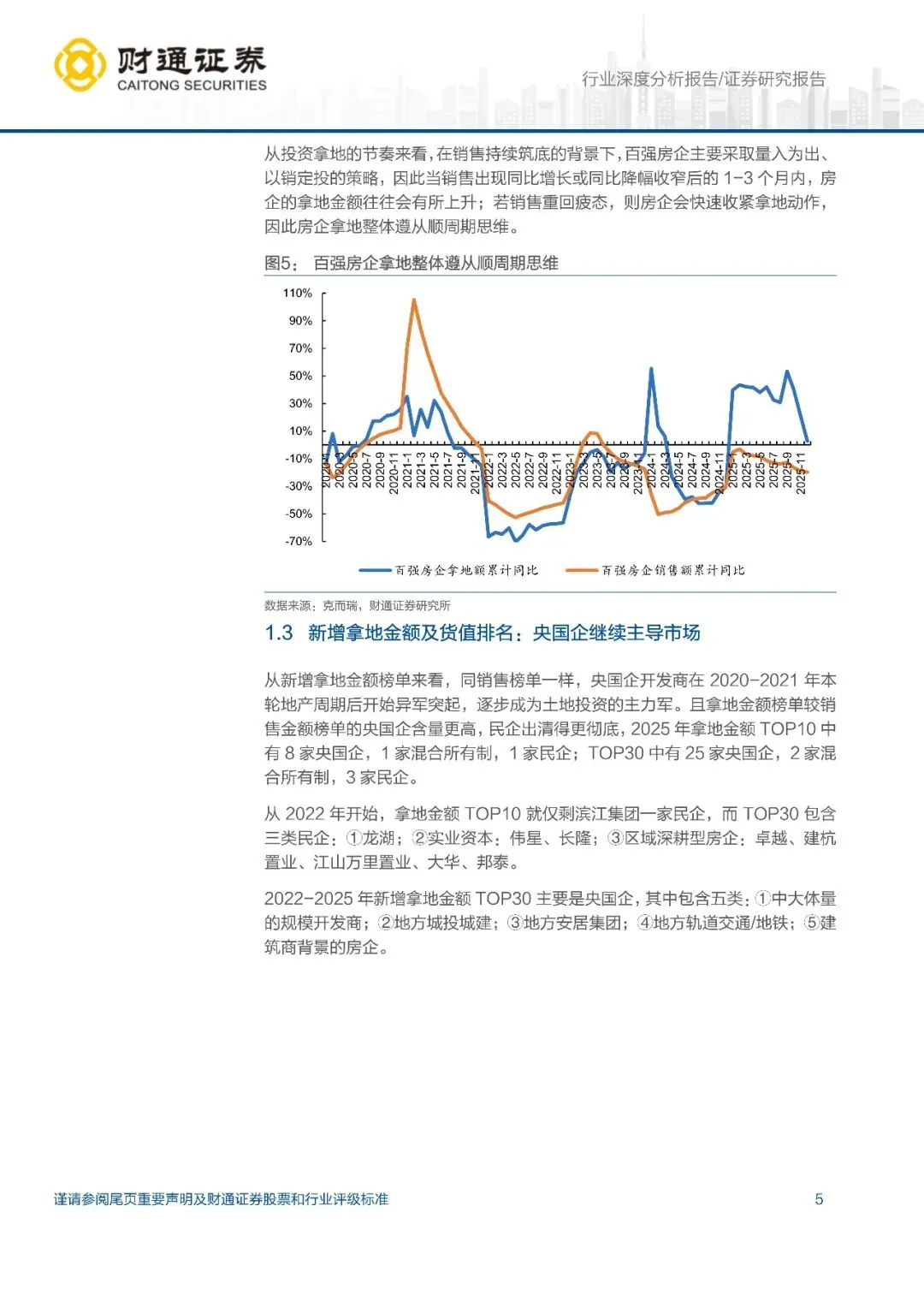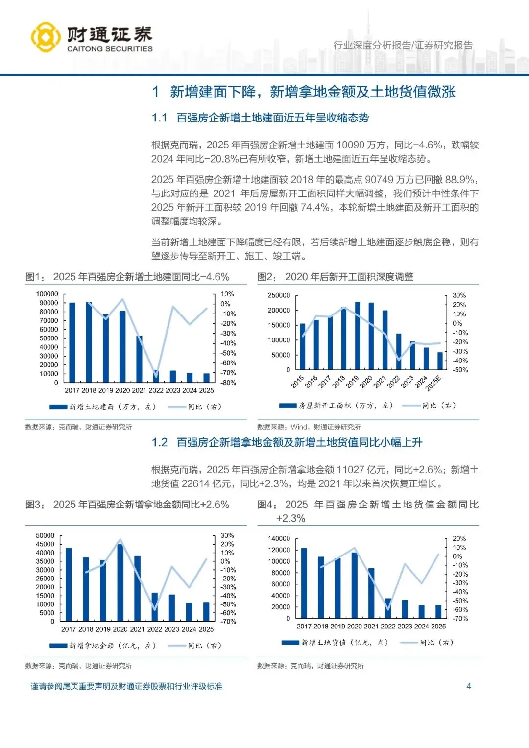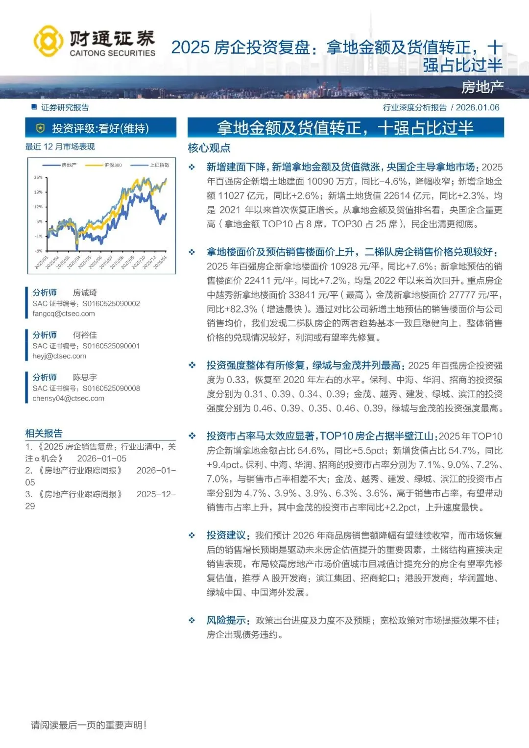 新增建面下降,新增拿地金额及货值微涨,央国企主导拿地市场:2025年百强房企新增土地建面 10090 万方,同比-4.6%,降幅收窄;新增拿地金额 11027 亿元,同比+2.6%;新增土地货值 22614 亿元,同比+2.3%,均是 2021 年以来首次恢复正增长。从拿地金额及货值排名看,央国企含量更高(拿地金额 TOP10 占 8 席,TOP30 占 25 席),民企出清更彻底。
