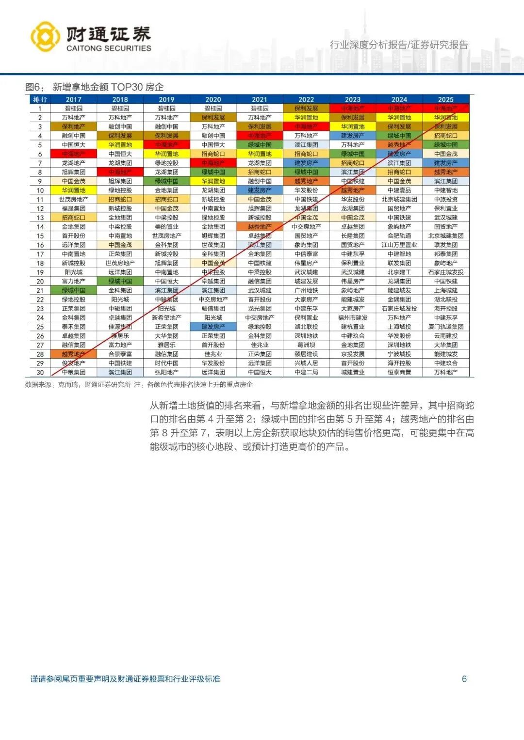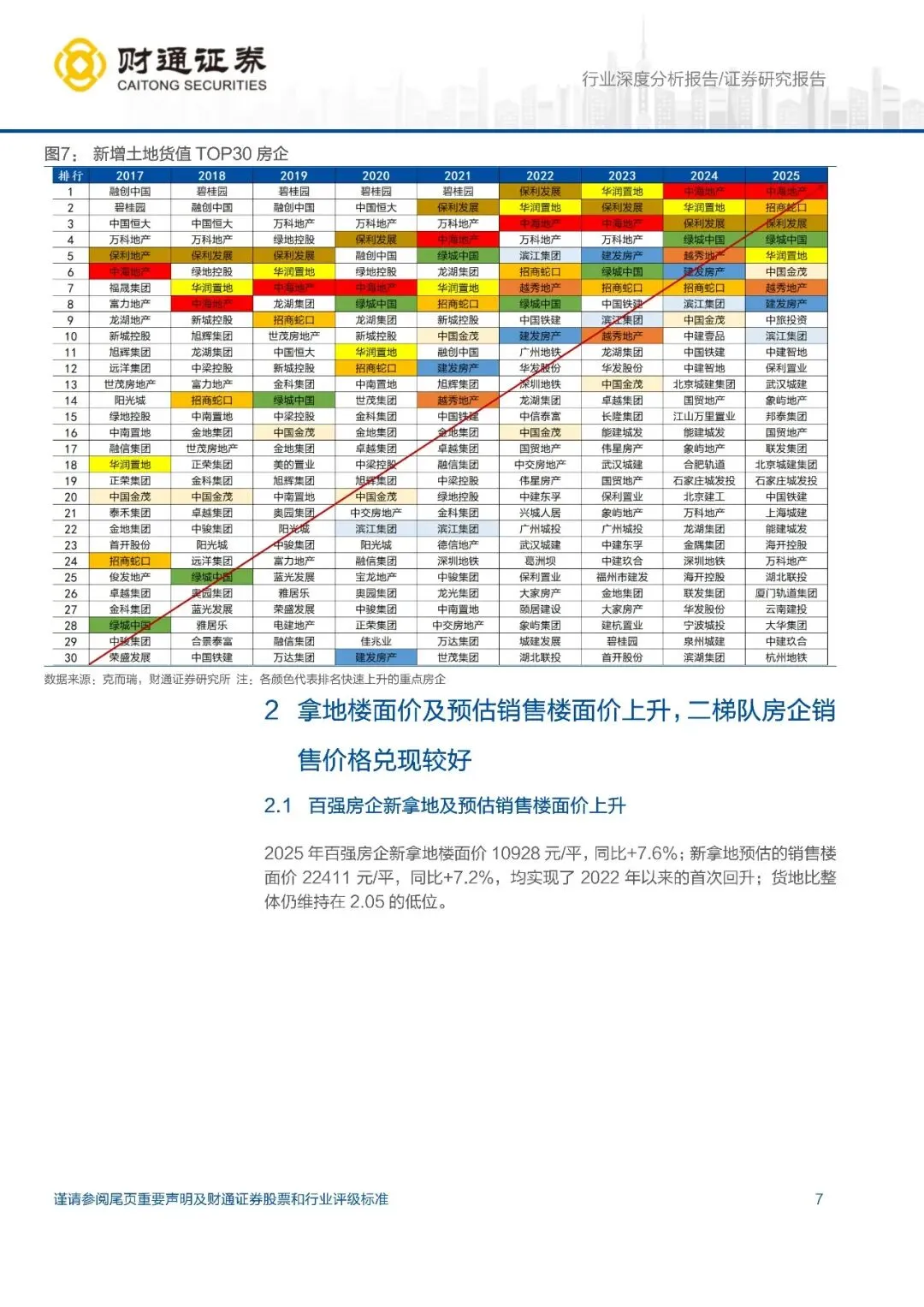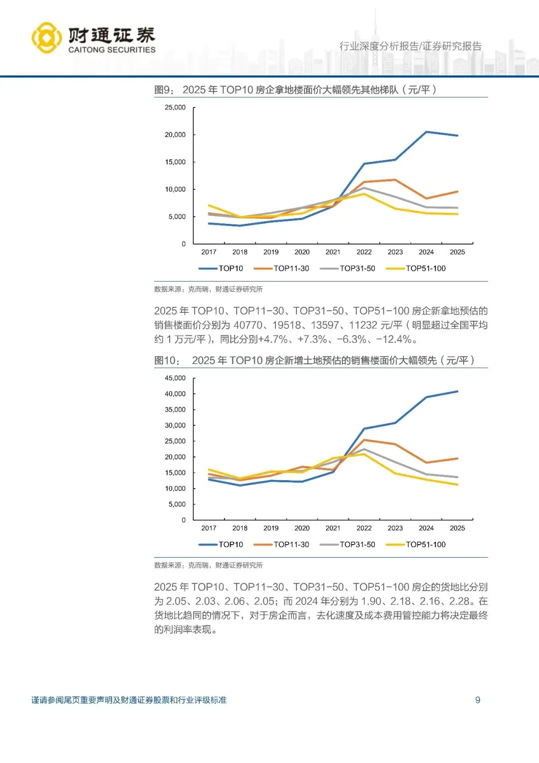 新增建面下降,新增拿地金额及货值微涨,央国企主导拿地市场:2025年百强房企新增土地建面 10090 万方,同比-4.6%,降幅收窄;新增拿地金额 11027 亿元,同比+2.6%;新增土地货值 22614 亿元,同比+2.3%,均是 2021 年以来首次恢复正增长。从拿地金额及货值排名看,央国企含量更高(拿地金额 TOP10 占 8 席,TOP30 占 25 席),民企出清更彻底。