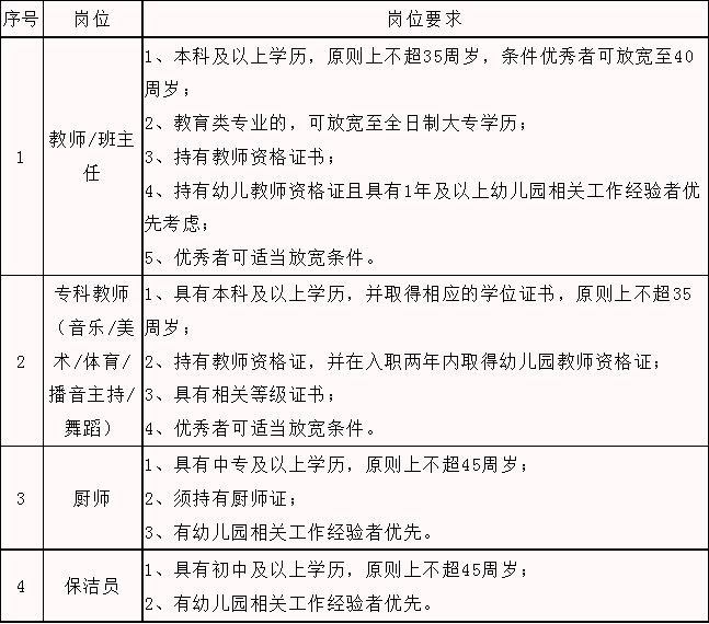 6.学前教育大专或以上学历,年龄在40岁以下,持幼儿园教师资格证,有幼儿园工作经验,有音乐、美术、舞蹈特长者优先;持幼儿园教师职称的优先考虑。
