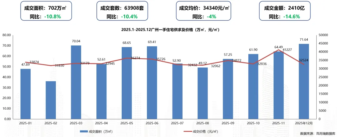 2025年广州全市一手住宅成交面积约702万㎡,同比下滑10.8%;成交套数63908套,同比下滑10.4%;成交均价为34340元/㎡,同比下滑4%。(同比2024年)