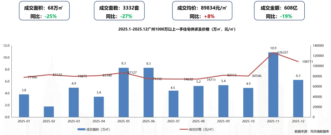 2025年广州全市1000万以上一手住宅成交面积约68万㎡,同比下滑25%;成交套数3332套,同比下滑27%;成交均价为89834元/㎡,同比上升8%。(同比2024年)