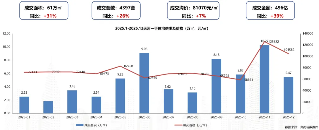 2025年天河区一手住宅成交面积约61万㎡,同比上升31%;成交套数4397套,同比上升26%;成交均价为81070元/㎡,同比上升7%(保利玥玺湾、保利天曜等入市,天河量价同比提升明显)。(同比2024年)