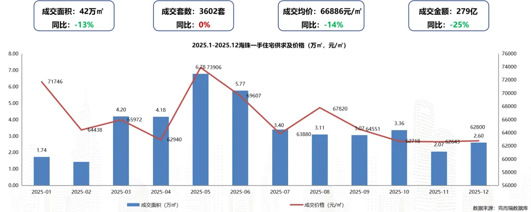 2025年海珠区一手住宅成交面积约42万㎡,同比下滑13%;成交套数3602套,同比持平;成交均价为66886元/㎡,同比下滑14%。(同比2024年)