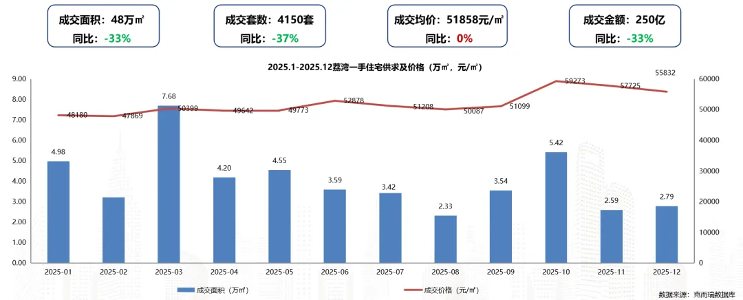 2025年荔湾区一手住宅成交面积约48万㎡,同比下滑33%;成交套数4150套,同比下滑37%;成交均价为51858元/㎡,同比持平。(同比2024年)