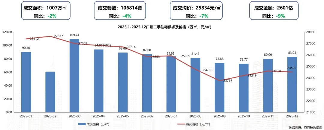 2025年广州全市二手住宅成交面积约1007万㎡,同比下滑2%;成交套数106814套,同比下滑4%;成交均价为25834元/㎡,同比下滑7%。(同比2024年)