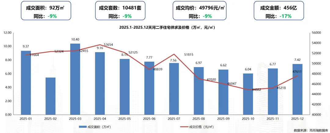 2025年天河区二手住宅成交面积约92万㎡,同比下滑9%;成交套数10481套,同比下滑9%;成交均价为49796元/㎡,同比下滑9%(同比2024年)。尤其是珠江新城商圈近8周连续量价齐升,数据证明标杆好房子对改善稳定预期作用。