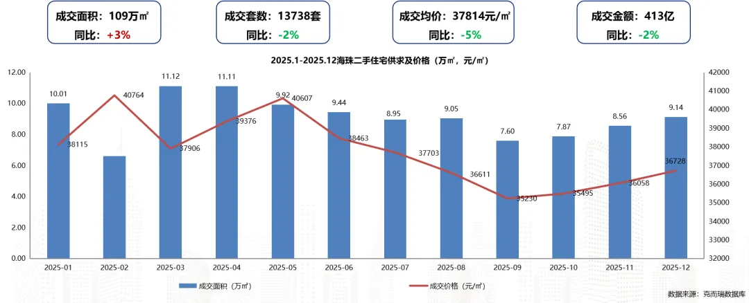 2025年海珠区二手住宅成交面积约109万㎡,同比上升3%;成交套数13738套,同比下滑2%;成交均价为37814元/㎡,同比下滑5%。(同比2024年)