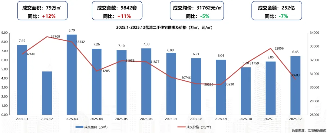 2025年荔湾区二手住宅成交面积约79万㎡,同比上升12%;成交套数19842套,同比上升11%;成交均价为31762元/㎡,同比下滑5%。(同比2024年)