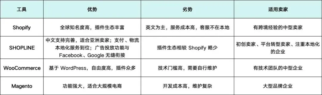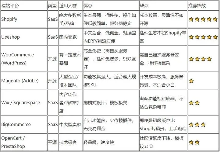 优点: 开箱即用,技术门槛低,集成了支付、物流、安全等功能,生态系统成熟。适合快速启动、产品SKU较多、对技术定制要求不高的B2C卖家。