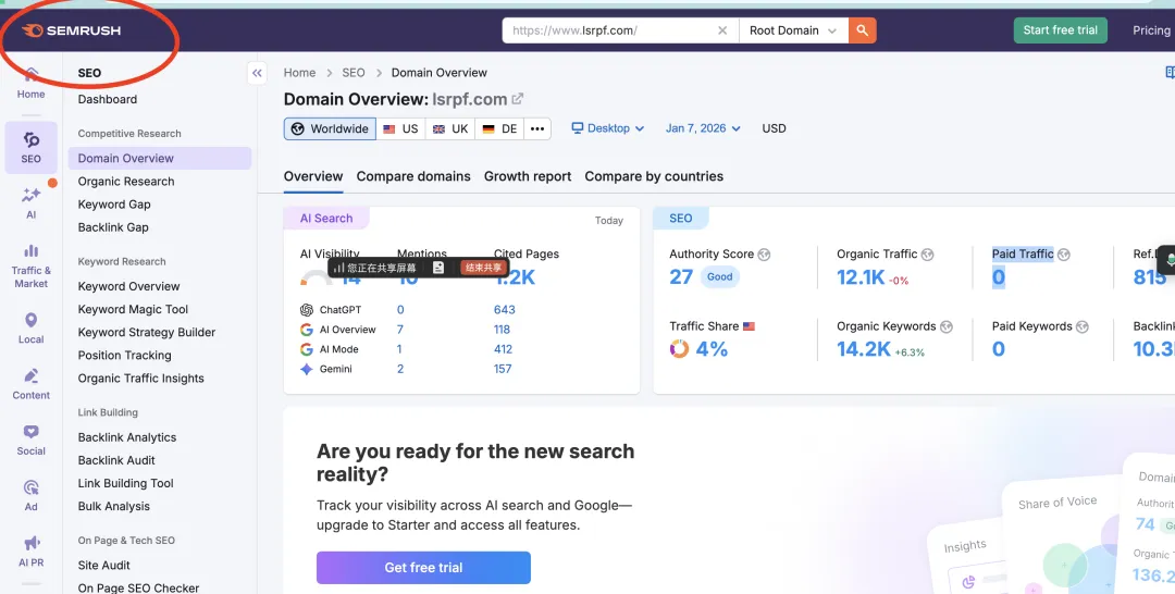 试用方法(以“Domain Overview”为例):在SEMRUSH首页的搜索框中,输入你竞争对手的域名,例如 www.gymshark.com。你将看到一个全面的仪表盘,显示:权威分(Authority Score): 网站的整体SEO权重。预估自然搜索流量(Organic Search Traffic): 每月通过SEO获得的访问量。付费搜索流量(Paid Search Traffic): 每月通过广告获得的访问量。外链数量(Backlinks): 有多少其他网站链接到它。