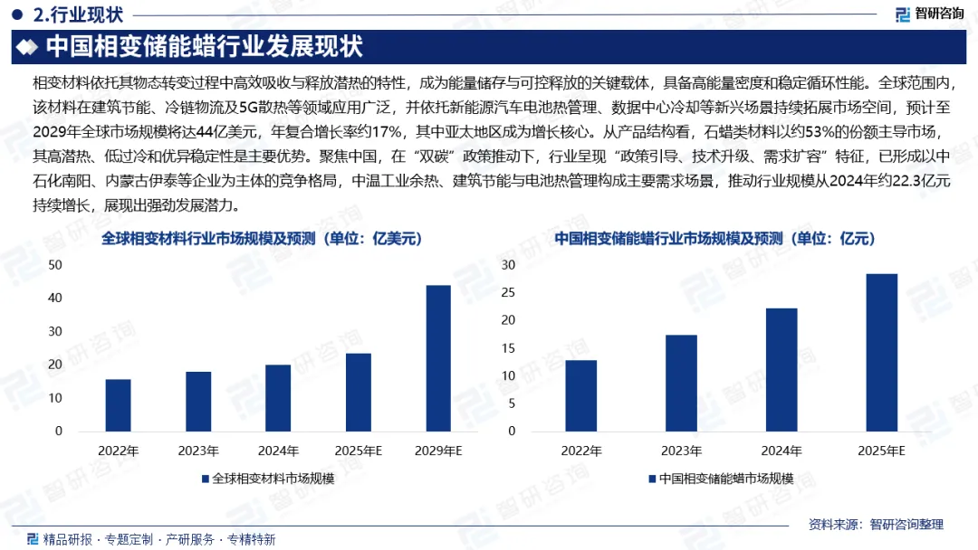 相变储能蜡作为有机固-液相变材料的核心品类,凭借其稳定相变、高潜热及长循环寿命的特性,成为低碳能源领域的关键技术。当前,中国相变储能蜡行业进入快速发展期。政策端,国家通过绿色建材、新型储能等专项行动方案构建系统性支持框架;标准端,2023年《相变材料用蜡》行业标准落地,规范原料工艺与检测方法,推动行业规范化。市场方面,全球相变材料市场规模预计从2024年20亿美元增至2029年44亿美元,亚太地区尤其是中国成为增长核心,2024年行业规模达22.3亿元,2025年有望突破28.5亿元。应用方面,相变储能蜡已在工业余热回收、建筑节能、冷链物流等领域广泛应用,并在新能源汽车电池热管理等新兴领域快速拓展。未来,中国相变储能蜡行业将朝着高性能材料研发、应用场景创新和产业链整合方向持续演进,通过微胶囊化、导热增强等技术突破,推动行业从规模扩张向高质量发展转型。