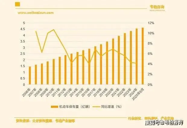 2024年,我国机动车保有量4.53亿辆,同比i增长4.1%。截至2025年9月底,全国机动车保有量达4.6亿辆,其中汽车达3.6亿辆,驾驶人达5.5亿人,机动车、驾驶人总量及增量均居世界第一。
