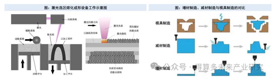 • 在技术路线方面,设备选区激光熔融(SLM)与选区激光烧结(SLS)工艺, 具有取材范围广、力学性能好、成形精度高、材料利用率高、可成形结构复杂程度高等优势,是增材制造的主流工艺。而金属3D与非金属3D打印相比,由于其工艺特点,具有成形结构精细和力学性能优越的突出优势,因此应用场景相对更广,工业化应用最成熟,尤其在航空航天、汽车和消费电子等领域。