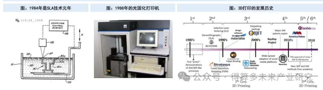 • 2)1980~1990年,光固化成型(SLA),熔融沉积成型(FDM)、选区激光烧结技术(SLS)等三项重要的基础3D打印技术诞生并投入使用,第一批3D打印公司也相继成立,3D System、EOS、Stratasys等公司至今仍是行业的主要参与者。