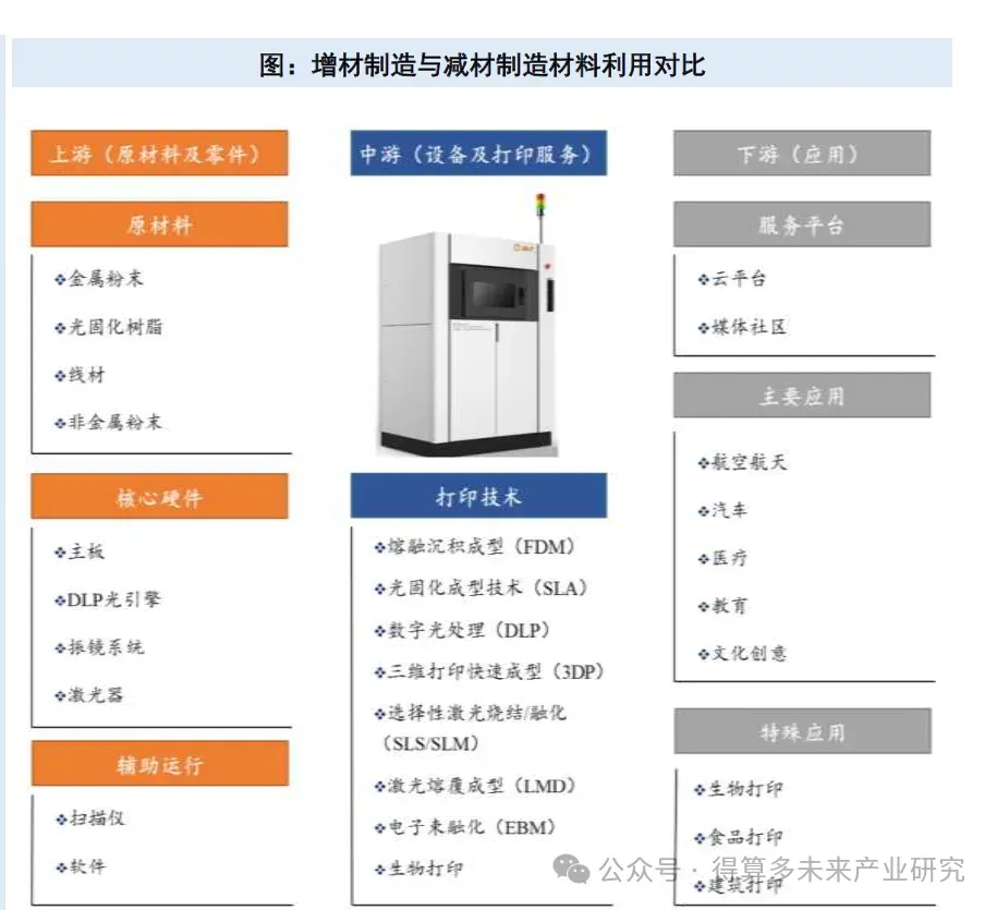 • 下游:增材制造技术的下游应用以航空航天、军工、船舶工业、核工业、汽车工业、轨道交通及医疗为主。目前该技术在下游行业的应用方式主要分为直接制造、设计验证和原型制造。直接制造是指根据三维模型,直接用增材制造技术生产最终产品,具有产品定制性强与产品精度硬度高的特点,是未来增材制造技术的主要发展趋势。与传统制造相比,采用增材制造技术进行设计验证及原型制造,可节约时间与经济成本。此外,增材制造在维修领域也具有市场,使用增材制造技术不仅能简化维修程序,还可实现传统工艺无法实现的高还原度与制造材料原型匹配的功能。