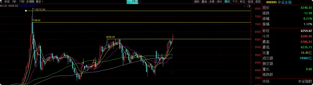 从中证全指看市场,月线图,2021年6000点已过,2015的7000点是下一个目标。历史最高是8000点。