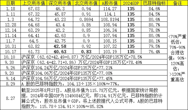 二,巴菲特指标 (<70%严重低估;70%-90%合理估值;90%-120%高估;>120%严重高估,我用2024GDP以提升敏感度,因为没有统计港股和美股中概股市值,增加安全边际)