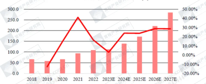 图表:中国火箭发射市场规模及增速(亿元)