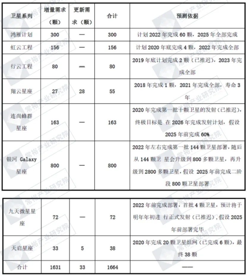 综上,可以对2025 年前已公布的我国通信卫星需求做出测算,预计2025 年底,我国通信卫星中大卫星需求12-13 颗、小卫星或微小卫星需求1664 颗。