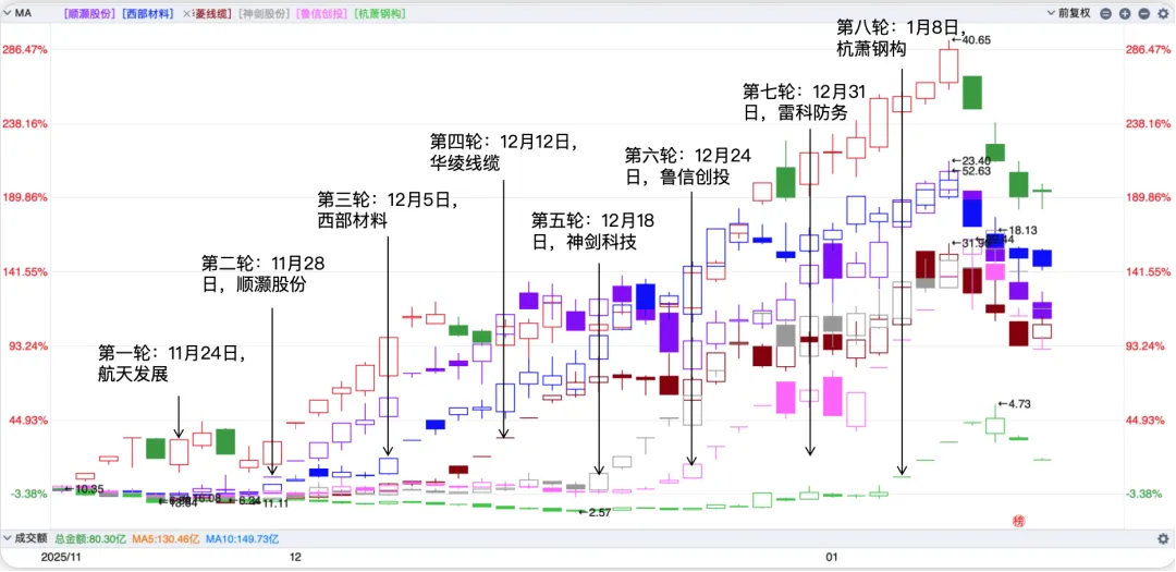 第八轮:1月8日,钱塘湾收个海上回收基地开工建设,商业航天再次启动大涨,前排是杭萧钢构(参与箭元科技火箭回收项目建设),1月13日板块强分歧,总龙头航天发展跌停,当天逆势抗跌的是鲁信CT、通宇通讯、杭萧钢构,但是次日全部补跌,板块见顶。