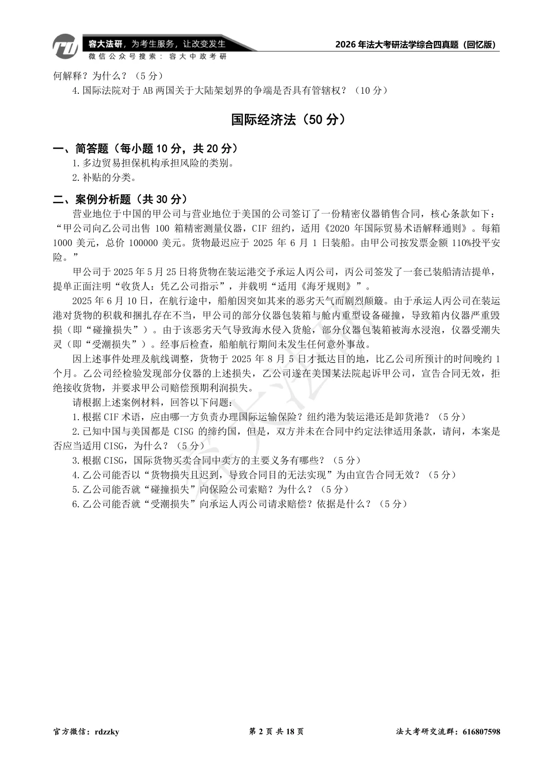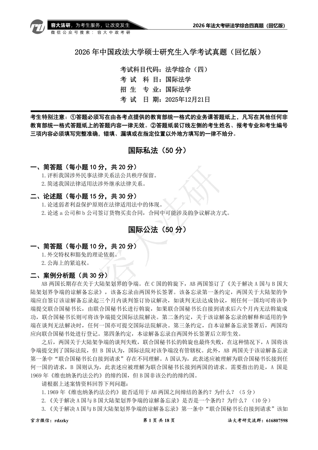 本文为今年26考研法大国际公法真题的参考答案,所谓“参考答案”,仅做“参考”,各位同学如有不同的看法或者疑惑欢迎文末留言、私信、或者群内交流与沟通。完整电子版答案添加官微(小政师兄:rdzzky或牛牛师姐:RDCSCUPL)领取。