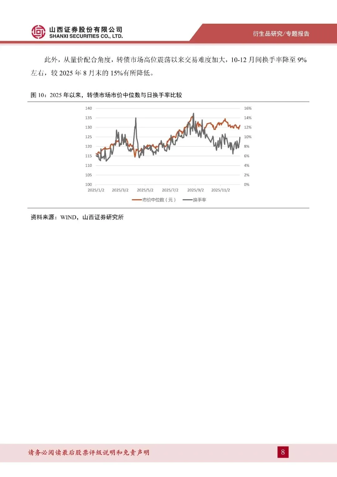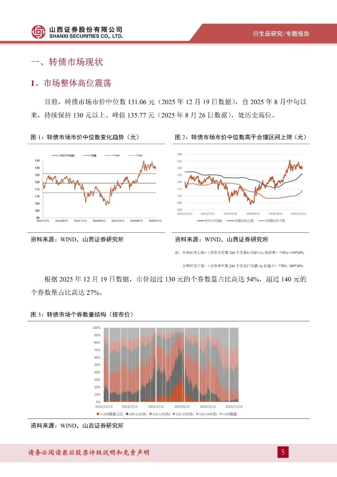 2025 年 8 月中旬以来,转债市场市价中位数在 129-135 元区间震荡。考虑到公募转债绝大多数强赎条款为 130%,同时公告暂不强赎的个券数量仅占 10-15%,我们认为 130 左右已是转债市场市价中位数可触及的上限。