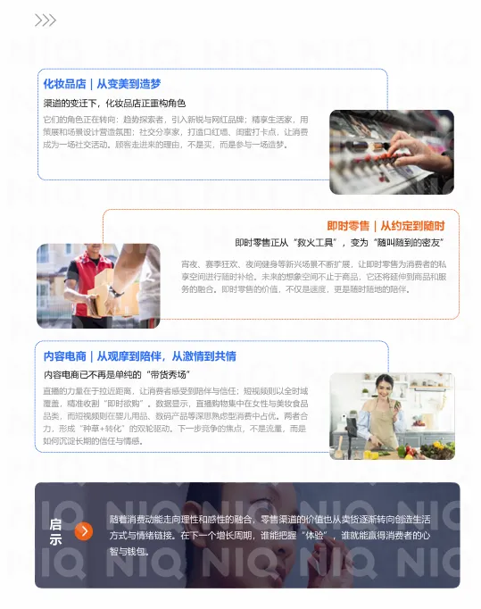 从“功能”到“体验”消费者不再满足于单纯的商品购买,更注重购物场景带来的生活方式与情绪价值。大型商超转型为“生活空间”,便利店成为新品试水阵地,即时零售和内容电商则通过场景化服务和情感陪伴满足消费者需求。