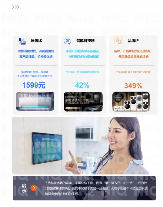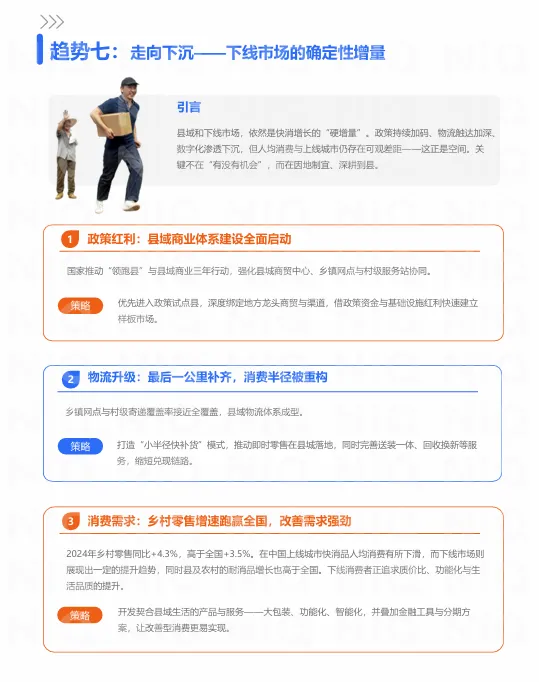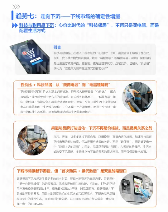 下线市场的确定性增量政策、物流和消费升级推动下沉市场成为增长引擎,品牌需通过“一县一策”本地化策略,开发契合县域需求的产品和服务,科技耐用品下沉则从“卖设备”转向“科技邻居”模式。