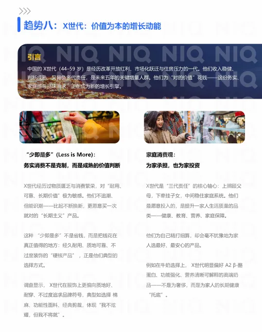 价值为本的增长动能44-59岁的X世代注重务实、家庭与品味,为“对的价值”买单,消费哲学体现为“少即是多”的长期主义,偏好耐用、可靠、有文化内涵的产品。