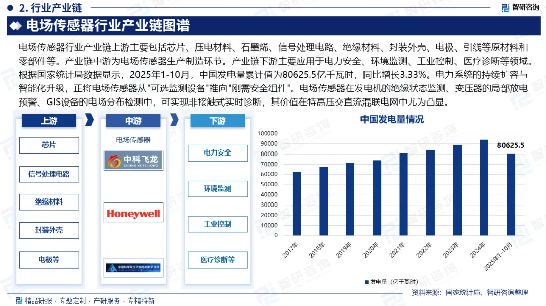产业链核心节点:根据国家统计局数据显示,2025年1-10月,中国发电量累计值为80625.5亿千瓦时,同比增长3.33%。电力系统的持续扩容与智能化升级,正将电场传感器从"可选监测设备"推向"刚需安全组件"。电场传感器在发电机的绝缘状态监测、变压器的局部放电预警、GIS设备的电场分布检测中,可实现非接触式实时诊断,其价值在特高压交直流混联电网中尤为凸显。