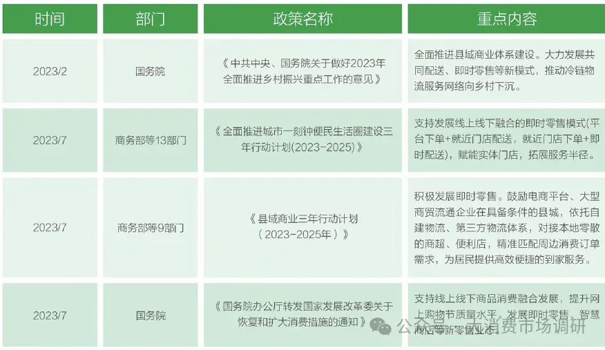 为促进即时零售健康有序发展,中央、部委和地方政府均出台了一系列政策措施,聚焦供需两侧。我国政府高度重视零售业创新,推动传统品牌商或零售商数字化转型,鼓励电商平台向线下延伸拓展,促进数字消费和绿色消费,主要聚焦三个方面:一是支持零售业创新发展,提升服务质量,二是培育多层次消费市场体系,扩大消费市场,三是开始明确提出支持即时零售发展。2023 年7 月,国务院办公厅转发国家发改委《关于恢复和扩大消费的措施》在两处提到:一是在农村领域大力发展即时零售;二是在数字消费领域发展即时零售等新零售业态。